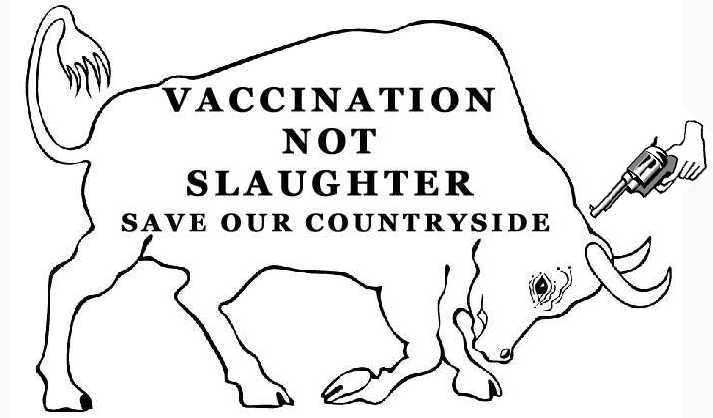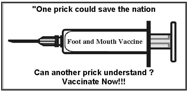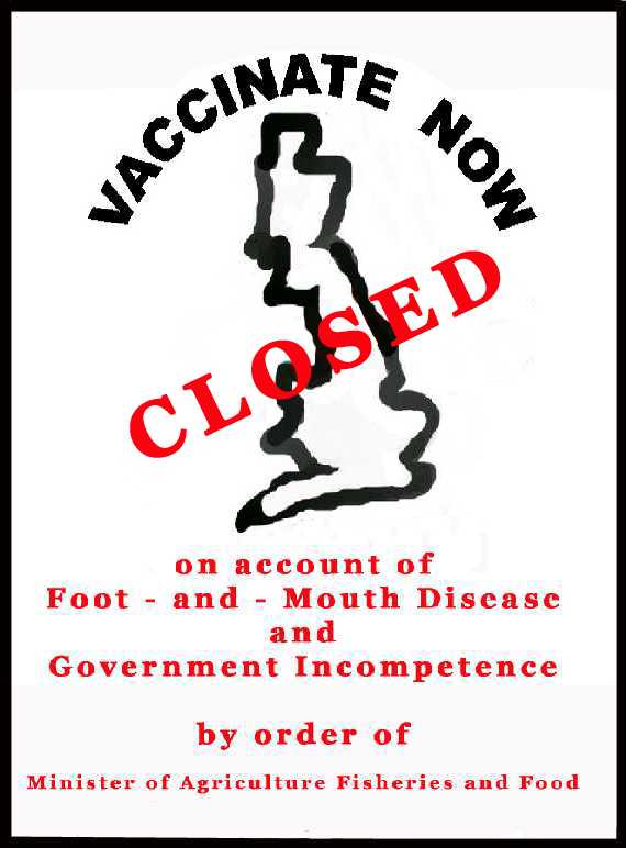 This it seems is not true. Maybe opponents of vaccination wish that it were for why has Pirbright declined offers of help in this matter? (Please see sheepdrove Web site http://www.sheepdrove.com/fam.htm Peter Kindersley's notes of meetings with Professor Fred Brown in London.) h) Vaccination would effectively close the doors for export of pigs, sheep and cattle and their meat from the UK for at least 4 years from now. If this were indeed true I would have thought that dedicated Vetinary practitioners would welcome the resulting benefit to animal welfare with the banning of live animal exports. Again, in the unlikely event of it being true, how does one explain the fact that we import meat from countries that vaccinate or have endemic foot and mouth problems? Also the loss of export trade is vastly outweighed by the losses to other sectors of the economy by the continuation of this outbreak. I) It would be difficult to decide which strains of the virus need to be covered and we might even have to vaccinate with several monovalent vaccines as multivalent varieties are in early development and very expensive. A huge red herring. Unless the authorities are even more deceitful than I thought, we are only talking about one strain in this outbreak. J) It would be difficult to get farmers to co-operate with a vaccination scheme. (This point was made to me in a letter from DEFRA using opposition from the NFU and others to absolve themselves from blame) Oh really? I don't think so if compensation for loss of stock was withheld from those not co-operating. k) It would be necessary to slaughter vaccinated animals anyway. Not true. To quote professor Brown "If it is decided to ring vaccinate, this would reduce the virus load enormously. In addition it would be ludicrous to slaughter the vaccinated animals subsequently." L) The costs of a vaccination policy are far greater than a slaughter and eradicate policy. Indeed? This has got to be nonsense particularly if the